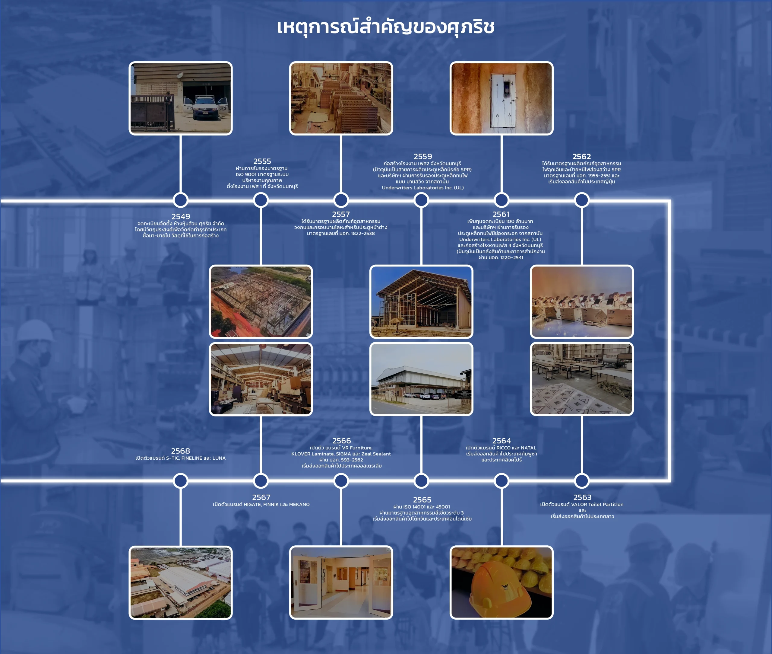 Increased registered capital to 100 million THB. The company received certification for fire-rated steel doors with vision panels from Underwriters Laboratories Inc. (UL) and constructed Phase 4 factory in Nonthaburi Province (currently serving as a warehouse and office building), certified under TIS 1220-2541.