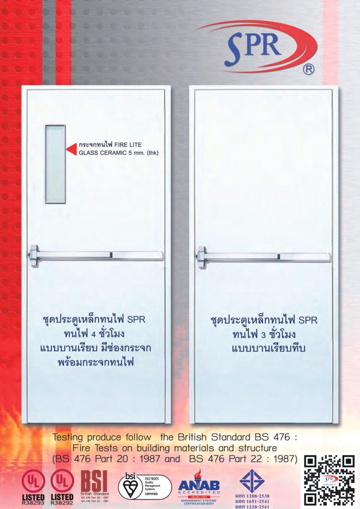 • ผลิตด้วยวัสดุและโครงสร้างที่สามารถ ทนทานต่อเปลวไฟและควัน ได้ตามมาตรฐานที่กำหนด (เช่น 60 นาที, 120 นาที)